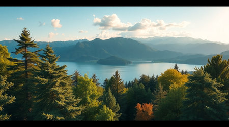 Panoramic view of the lake, mountains and forest in autumn