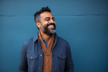 Portrait of a smiling indian man standing against blue wall outdoors