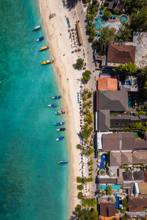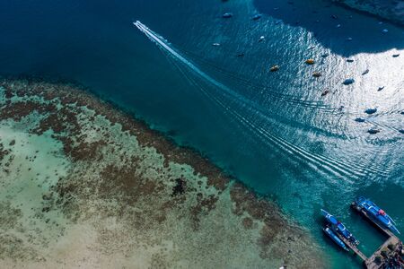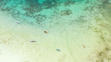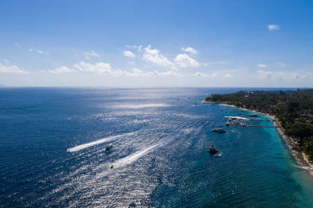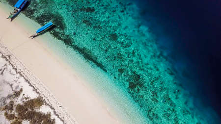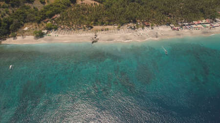 Boats on the beach. Seascape from drone. Blue water background from top view. Summer seascape from air. Gili Meno island, Indonesia. Travel - image