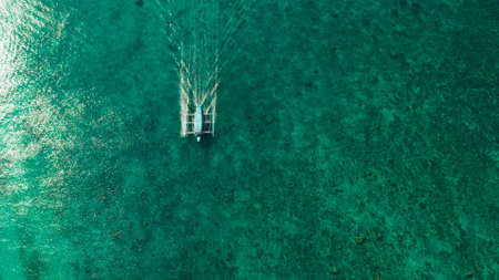 Tourist motor boat on the surface of turquoise water in tropical lagoon, aerial view. Seascape with beach on tropical island. Summer and travel vacation concept. Boracay Island, Philippines
