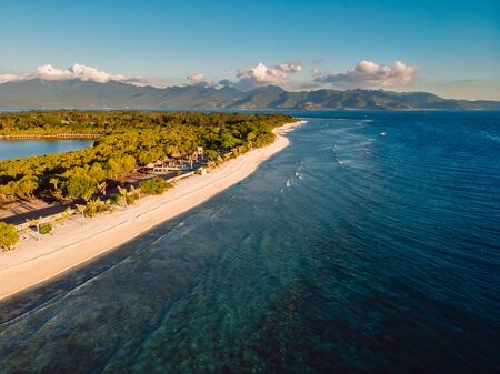 Aerial view of Gili Trawangan Island, Indonesia with morning sunrise sunlight. Lombok, Indonesia,