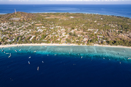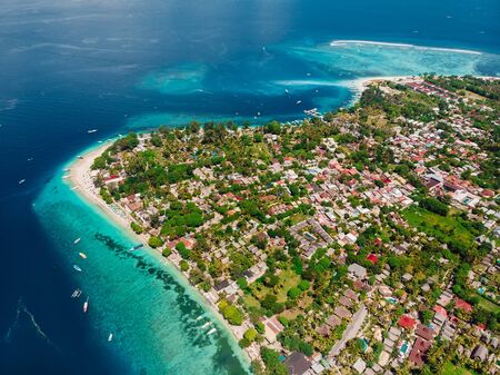 Aerial view of a beautiful, small, tropical island surrounded by fringing coral reef (Gili Air, Indonesia)