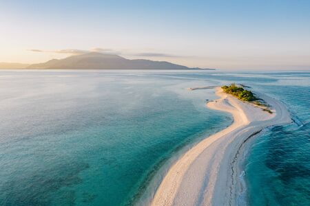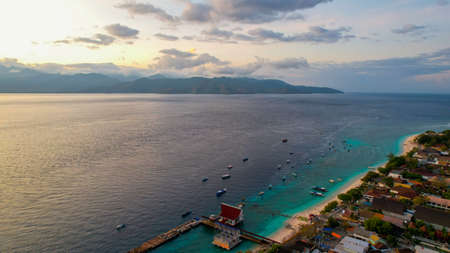 Aerial view of the Gili Islands off the coast of Lombok, Indonesia, at sunset. The Gilis are the most popular tourist destination in Lombok.