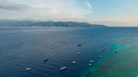 Aerial landscape view of Indonesian fishing boats mooring near a coral reef in Gili Trawangan Island near Bali and Lombok islands Indonesia