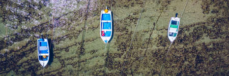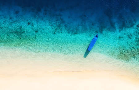 Boats in the blue lagoon. Aerial view of floating boat on transparent turquoise water at sunny day. Top view from drone. Seascape with motorboat in bay. Travel - image