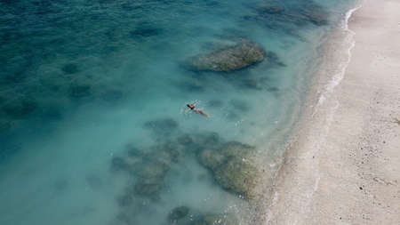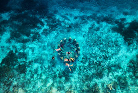 Tourists snorkeling over coral reef with clear blue ocean water, aerial view. People swim in the transparent sea between coral reefs. Summer and travel vacation concept.
