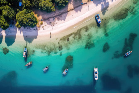 Top down aerial view of colorful boats and sunshades on a tropical beach on a small island fringed by a coral reef