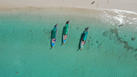 Stunning summer landscape. Aerial view of fishing long tail boat group in turquoise Andaman sea near white beach and resort at Koh Lipe or Lipe island, Satun, Southern Thailand. Shot from drone