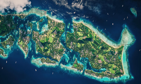 Tropical archipelago aerial view, lush islands, turquoise waters, sailing boats, idyllic landscape, travel brochure