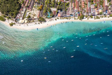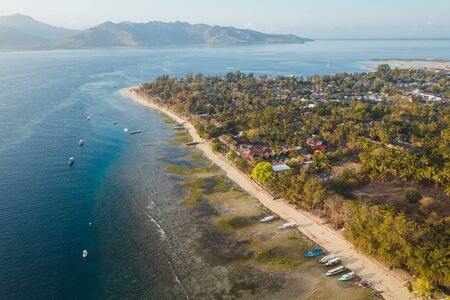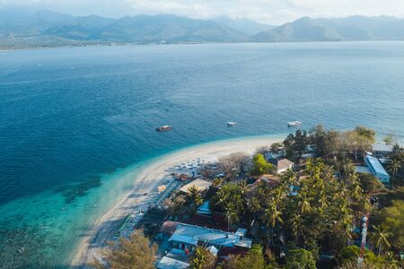 Tropical island with sandy beach, boats and turquoise crystal ocean, aerial view. Gili islands