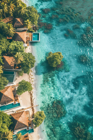 An aerial view showcasing a luxurious beach resort with private pools and white sand, surrounded by lush greenery and clear turquoise ocean waters, creating a serene coastal retreat ambiance.