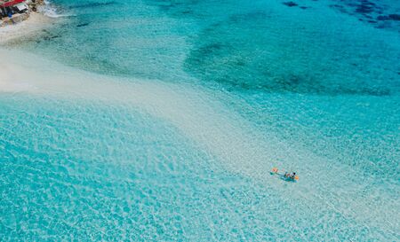 Aerial drone view of in kayak in crystal clear lagoon sea water during summer day near Koh Lipe island in Thailand. Travel tropical island holiday concept