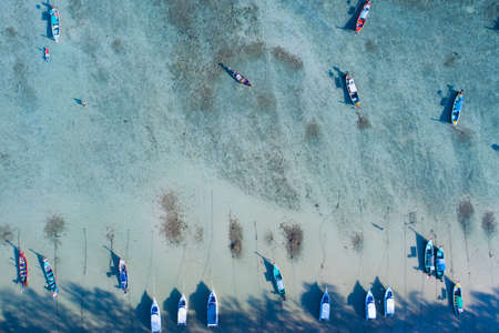 Aerial view top down of Thai traditional longtail fishing boats in the tropical sea beautiful beach in phuket thailand.