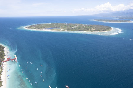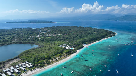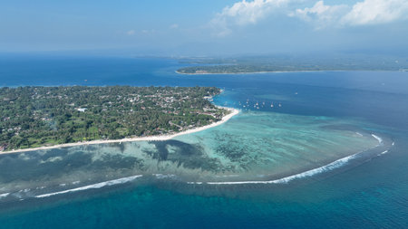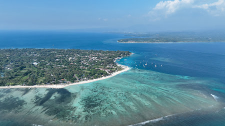 A breathtaking aerial view of the crystal clear water surrounding the tropical paradise of Gili Air, Gili Meno, and Gili Trawangan. Indonesian islands invite you to discover beaches and marine life