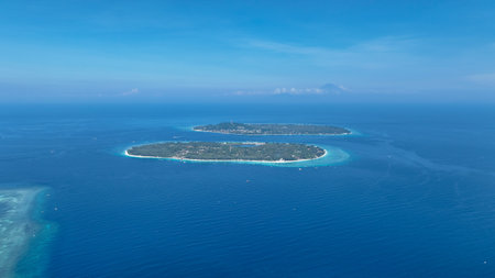 Drone aerial view of Gili islands, Lombok, Indonesia. Daytime panorama of Gili Trawangan, Gili Meno and Gili Air. Clear blue water, coral reefs and white sandy beaches. Tropical paradise from above
