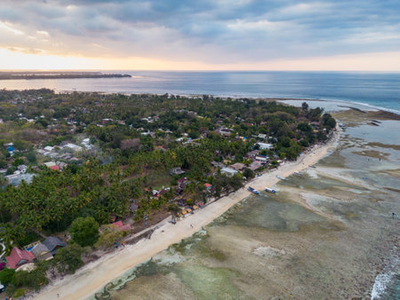Sandy beach with village, coconut palm plantation and crystal turquoise ocean in Nusa Penida. Aerial view