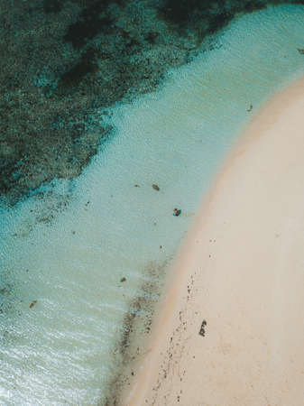 Aerial drone view of a beautiful tropical island with beach, coral reef, boats and snorkelers