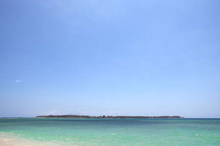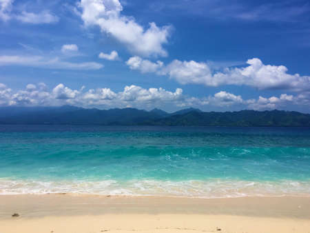 Natural real beach of tropical island with blue clean water and other mountain coast on background, Gili Travangan, Indonesia