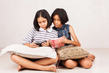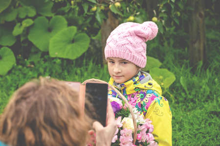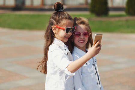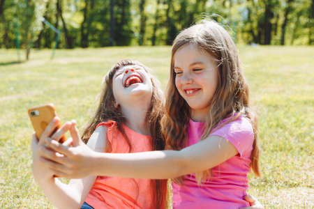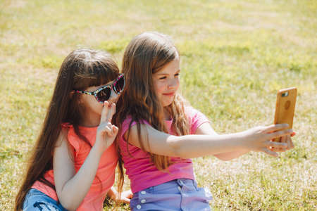 keep a blog. Little girls take a selfie for a blog. video call. Online social networks.