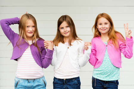 Group of 3 little girls standing outdoors against white wooden background, wearing denim jeans and colorful jackets