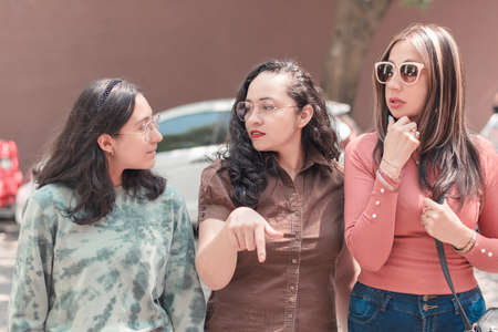 Three beautiful young women walk in the city, using phone outdoors