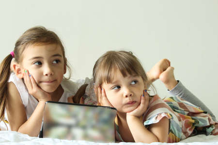 Curious little sisters having fun watching digital tablet on bed