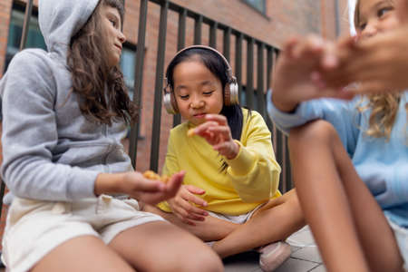 Hapyy three girls friends sitting in sidewalk, talking, listening to music, having snack and great summer time together. Street style.