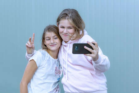 Two sisters twins beautiful girls in casual doing selfie on smartphone on grey background isolated