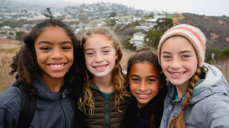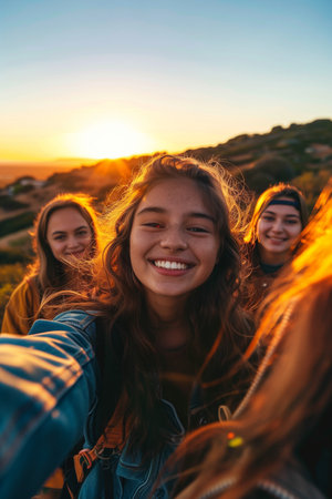 young teen diverse girls taing selfies in the nature. High quality photo