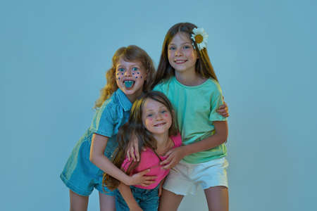 Expressive girls. Set of images of cute kids, happy girls isolated on multicolored background in neon light. Emotions, facial expression and childhood concept.