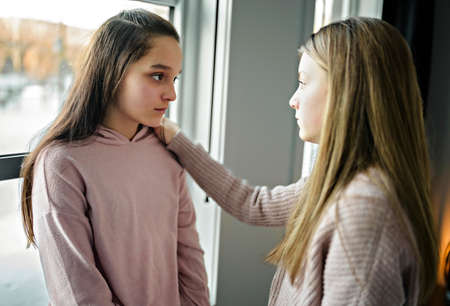 Teenage girl consoling her sad friend on her bedroom