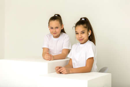 Two little girls posing in the studio on white cubes