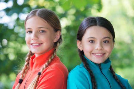 Summer portrait of two adorable kid girls hugging each other
