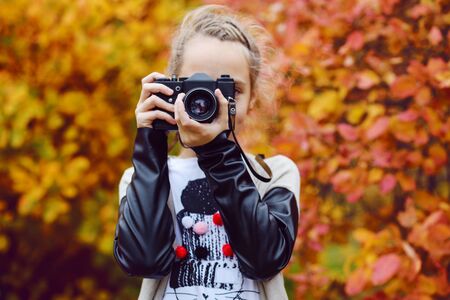 teen girl taking a shoot with old photo camera