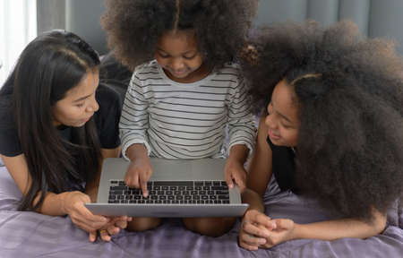 Asian-African American family Use a laptop to surf the Internet and shop online. On the bed in bedroom in the holiday.