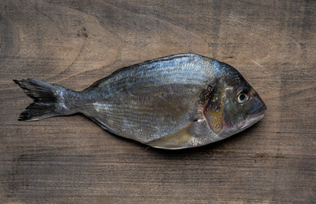Fresh sea bream on a wooden board with rosemary, salt and lemon