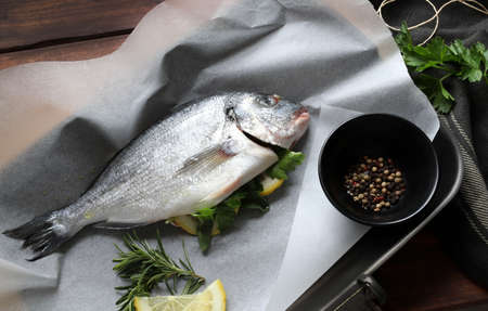 Cooking concept. Delicious fresh fish with aromatic herbs, spices and lemon ready to cook. Sea bream. Healthy food, diet. Directly above.
