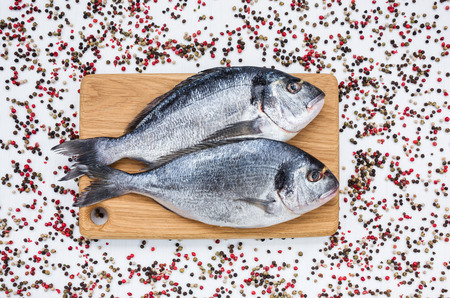 Fresh fish dorado. Dorado and ingredients for cooking on a table.