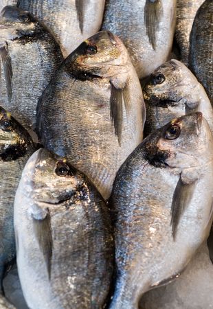 Close Up of aurata on ice store counter. Fresh sea bream on displayed at supermarket. Sell cold iced seafood in a market. Healthy sea food diet concept.