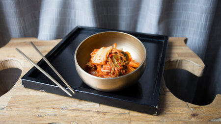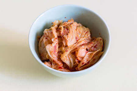Cabbage kimchi in the bowl, very popular korean traditional fermented food.