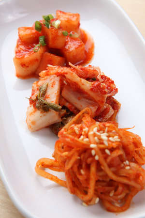 Top view of plate with kimchi and radish traditional Korean fermented food. Seoul, South Korea