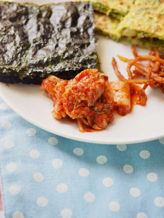 Korean side dish seaweed, egg roll, kimchi, squid