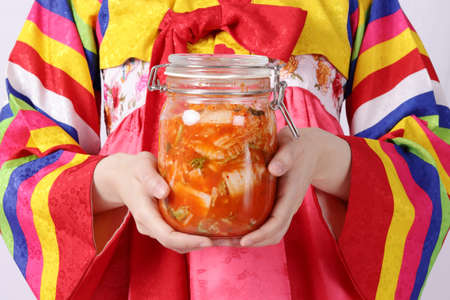 Korean woman wearing hanbok holds a bottle of kimchi With white cabbage, carrot, radish, onion, ginger, apple, chili and salt Is a delicious fermented food