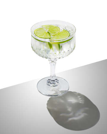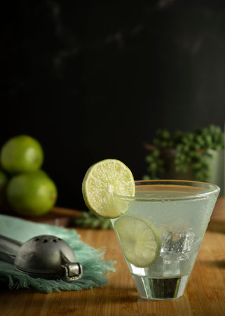 A refreshing glass of alcohol with a lime slice. Perfect for cocktail menus and summer drink promotions.