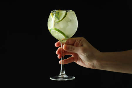 Female hand hold glass of cocktail with citrus on dark background