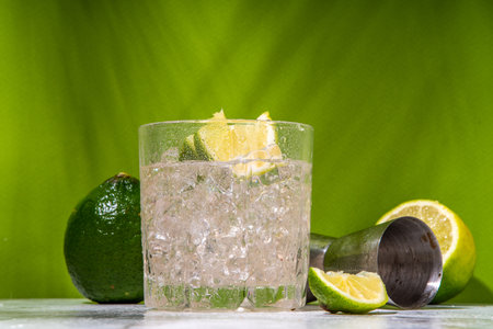 Classic cocktail with lime and ice on a green background with shadows. AI generated