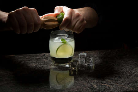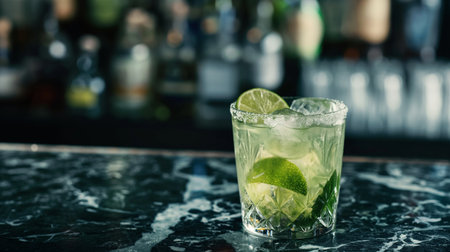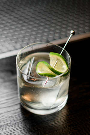 Cocktail with lime and ice on the bar counter in bar