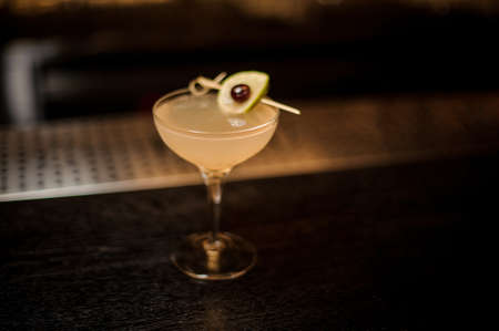 Glass of a Daiquiri cocktail decorated with lime slice and berry standing on the bar counter on the blurred background
