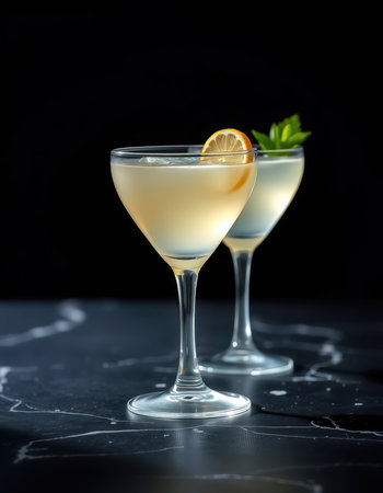 Two cocktails garnished with lemon and mint sit on a black marble surface