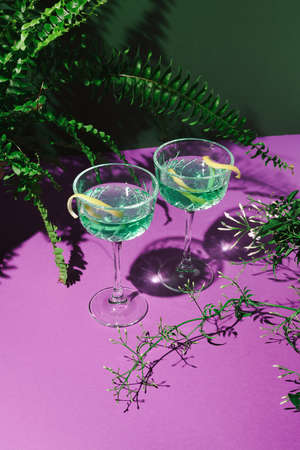 Creative layout made with party cocktails in champagne glasses , exotic leaves and Jasmine branches with delicate beautiful buds on violet and green background. Natural modern composition.